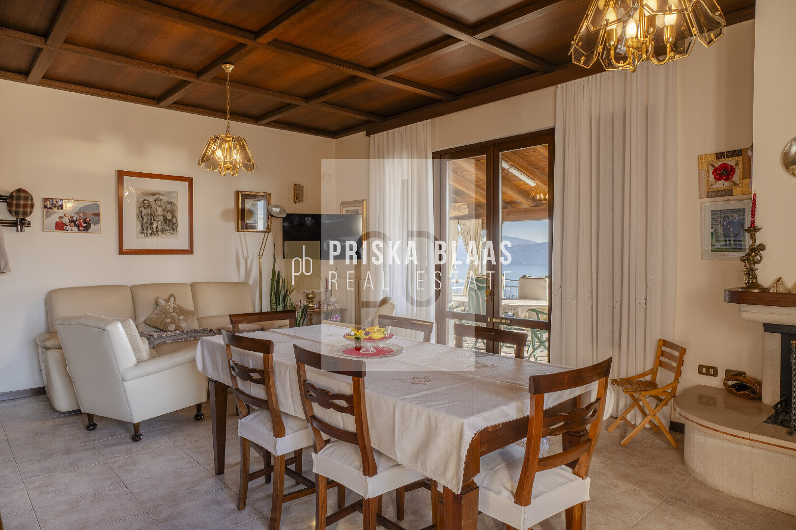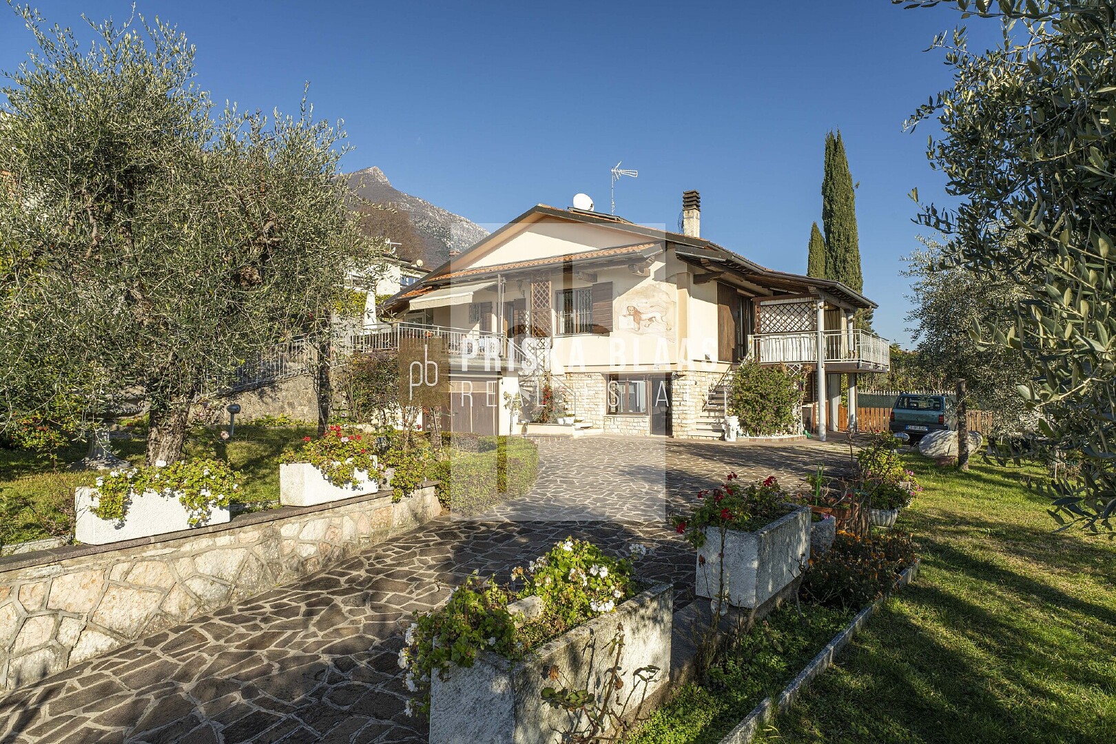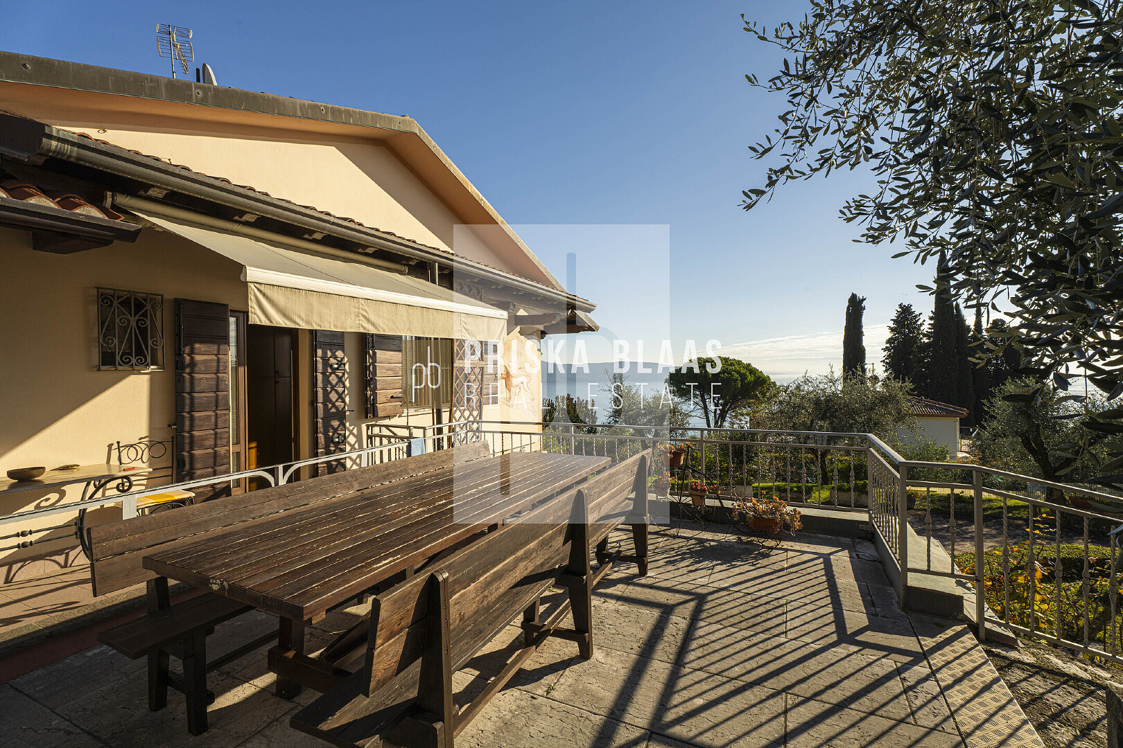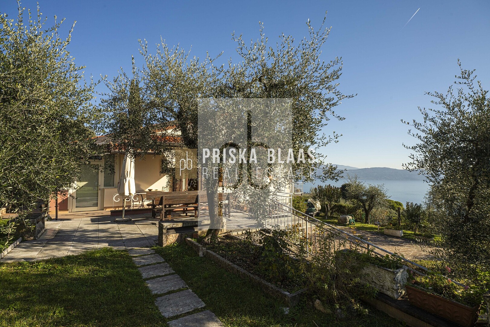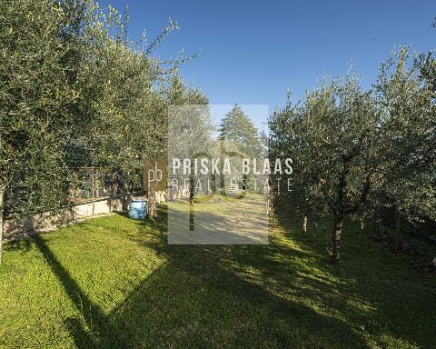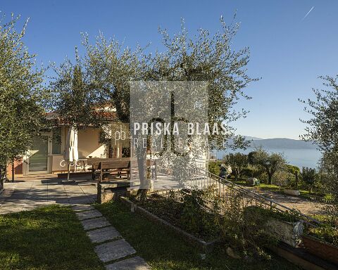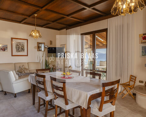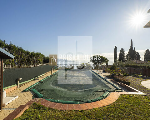 Bereits beim Betreten des Hauses spürt man die besondere Atmosphäre: Das großzügige, lichtdurchflutete Wohnzimmer mit integriertem Essbereich öffnet sich durch große Fensterfronten direkt zur Panoramaterrasse. Innen- und Außenbereich verschmelzen harmonisch miteinander und geben den Blick frei auf das glitzernde Blau des Sees – ein Ausblick, der zu jeder Tageszeit fasziniert. Ob beim Frühstück in der Morgensonne oder bei einem Glas Wein zum Sonnenuntergang – der Seeblick ist stets der Mittelpunkt dieses Hauses. Die Villa verfügt zudem über eine separate Küche, zwei komfortable Schlafzimmer sowie zwei Badezimmer. Im Untergeschoss befinden sich mehrere Kellerräume sowie zusätzliche Flächen mit großem Entwicklungspotenzial. Durch eine Modernisierung könnte hier ein exklusiver Wellnessbereich entstehen – beispielsweise mit Sauna, Fitnessraum oder privatem Spa. Der Außenbereich präsentiert sich als privates Urlaubsparadies: Ein Swimmingpool mit herrlicher Aussicht lädt zum Entspannen ein, großzügige Sonnenterrassen mit Liegebereich sowie ein BBQ-Bereich schaffen den perfekten Rahmen für gesellige Abende und unvergessliche Sommertage. Die mediterrane Umgebung und die ruhige Lage unterstreichen das Gefühl von Exklusivität und Rückzug.
