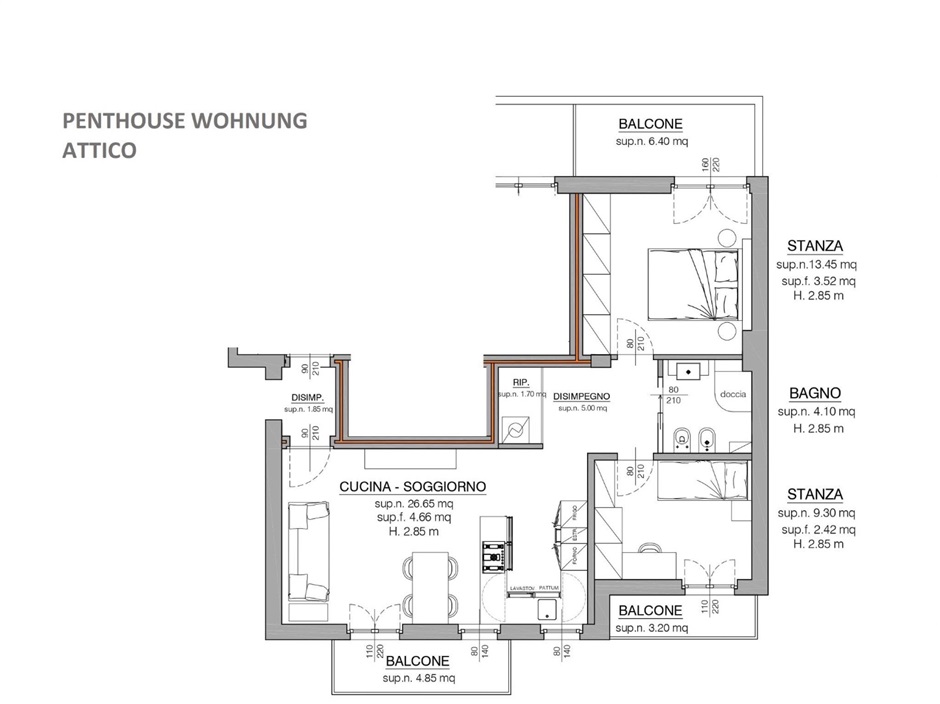 Tre balconi panoramici regalano scorci unici sulla città, mentre gli interni, eleganti e contemporanei, raccontano cura e raffinatezza in ogni dettaglio. Riscaldamento a pavimento, domotica e finiture di pregio trasformano la casa in un’oasi di comfort moderno, dove la tecnologia incontra il gusto.